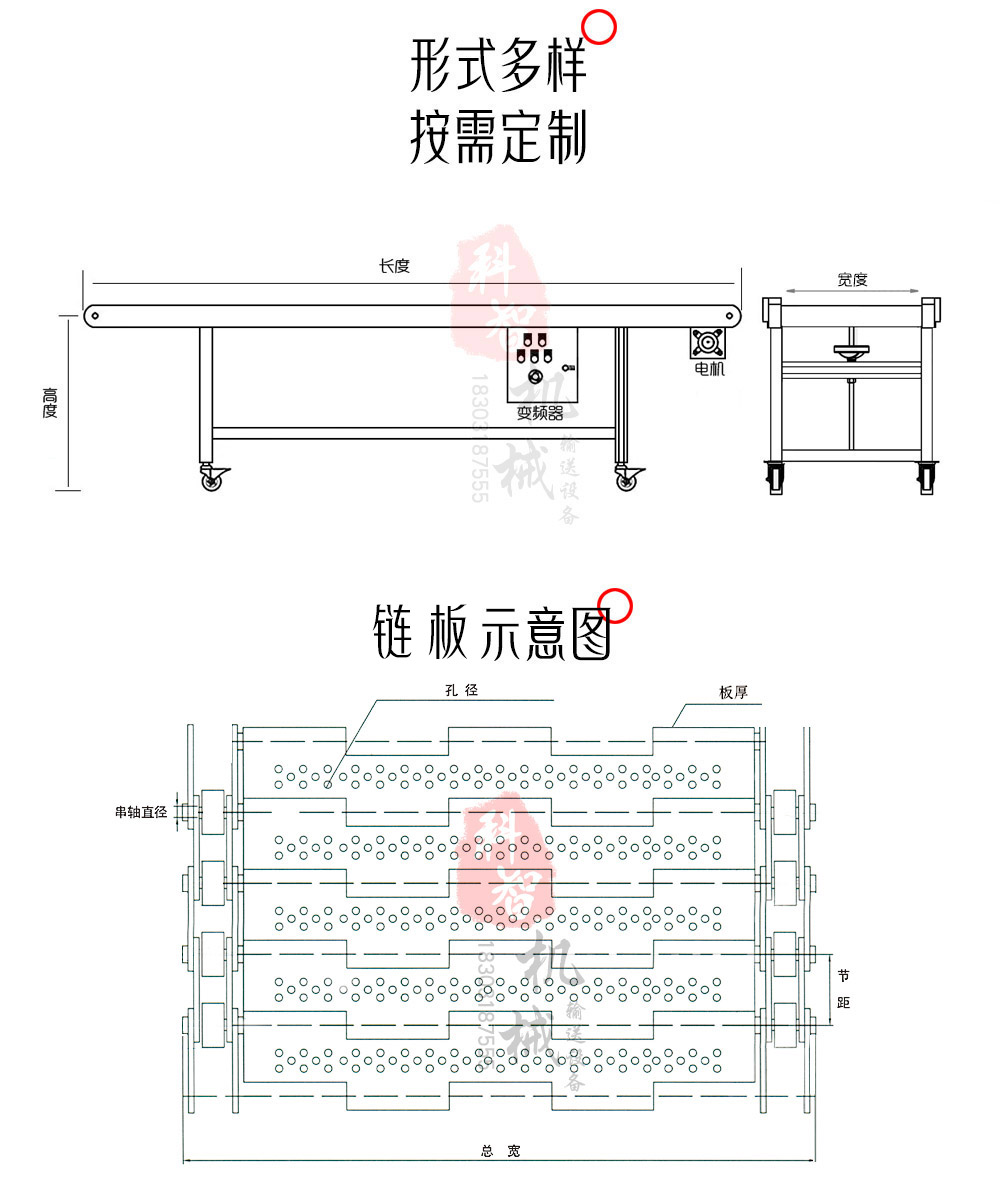 鏈板定制規格: 鏈條節距:25.4mm / 31.75mm / 38.1mm / 50.8mm/非標100mm/非標150mm