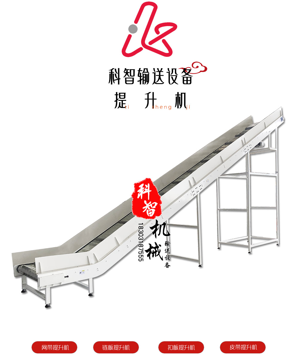 輸送帶類型:鏈板提升機(jī)、網(wǎng)帶提升機(jī)、皮帶提升機(jī)、斗式提升機(jī)、螺旋提升流水線。