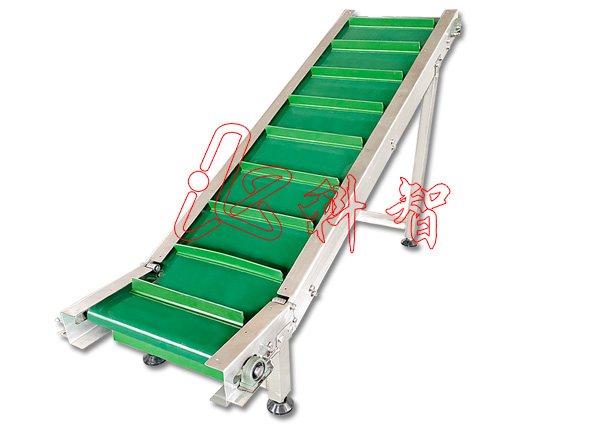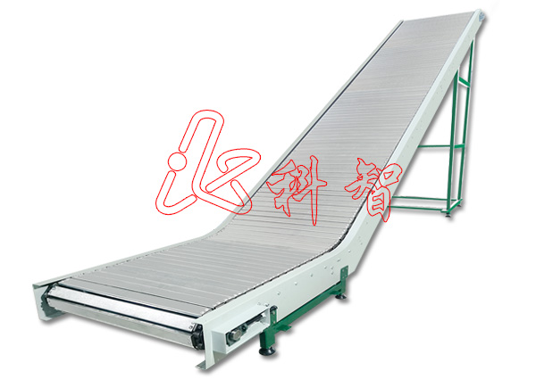 2) 鏈板提升輸送機可用于樓層間搬運物品的平板式輸送機,其斜坡角度可達到35度,為防止物品在傾斜面上滑動,輸送機的承載板條上設置有間距為100mm的擋桿.輸送能力為50-100t/h,速度為28m/min。