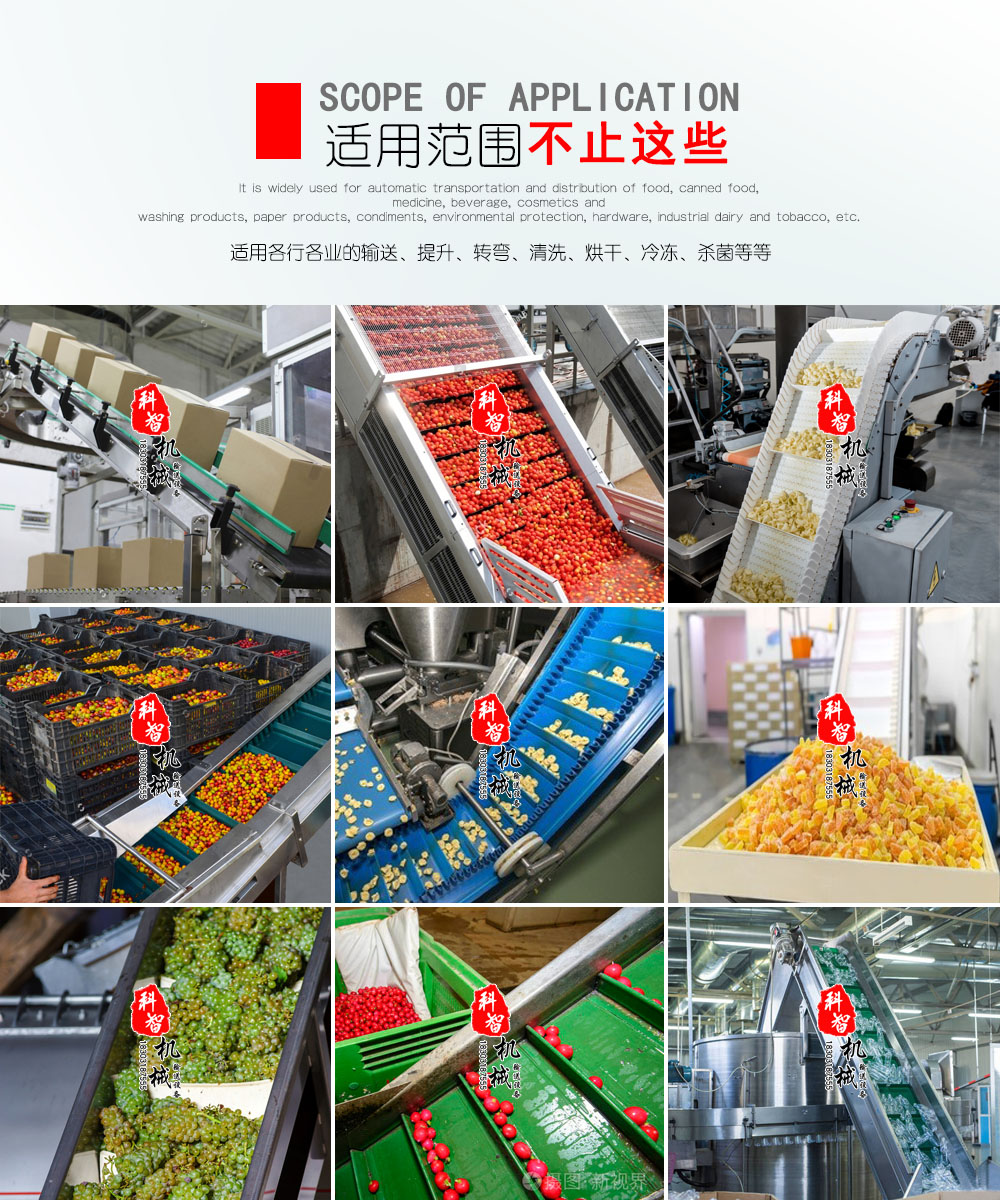 鏈板式提升機廣泛用于各種水果、禽肉以及各類玻璃瓶、PET瓶、易拉罐、玻璃、食品、速凍、化纖、電子、化工、電器、熱處理、烘干等行業(yè)。