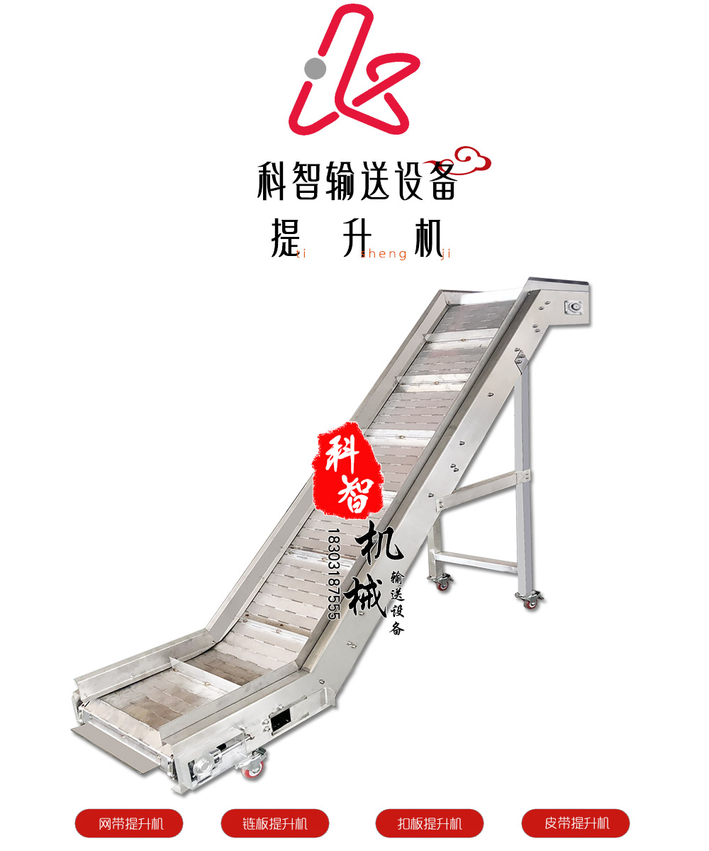 輸送帶類型:鏈板提升機、網帶提升機、皮帶提升機、斗式提升機、螺旋提升流水線。