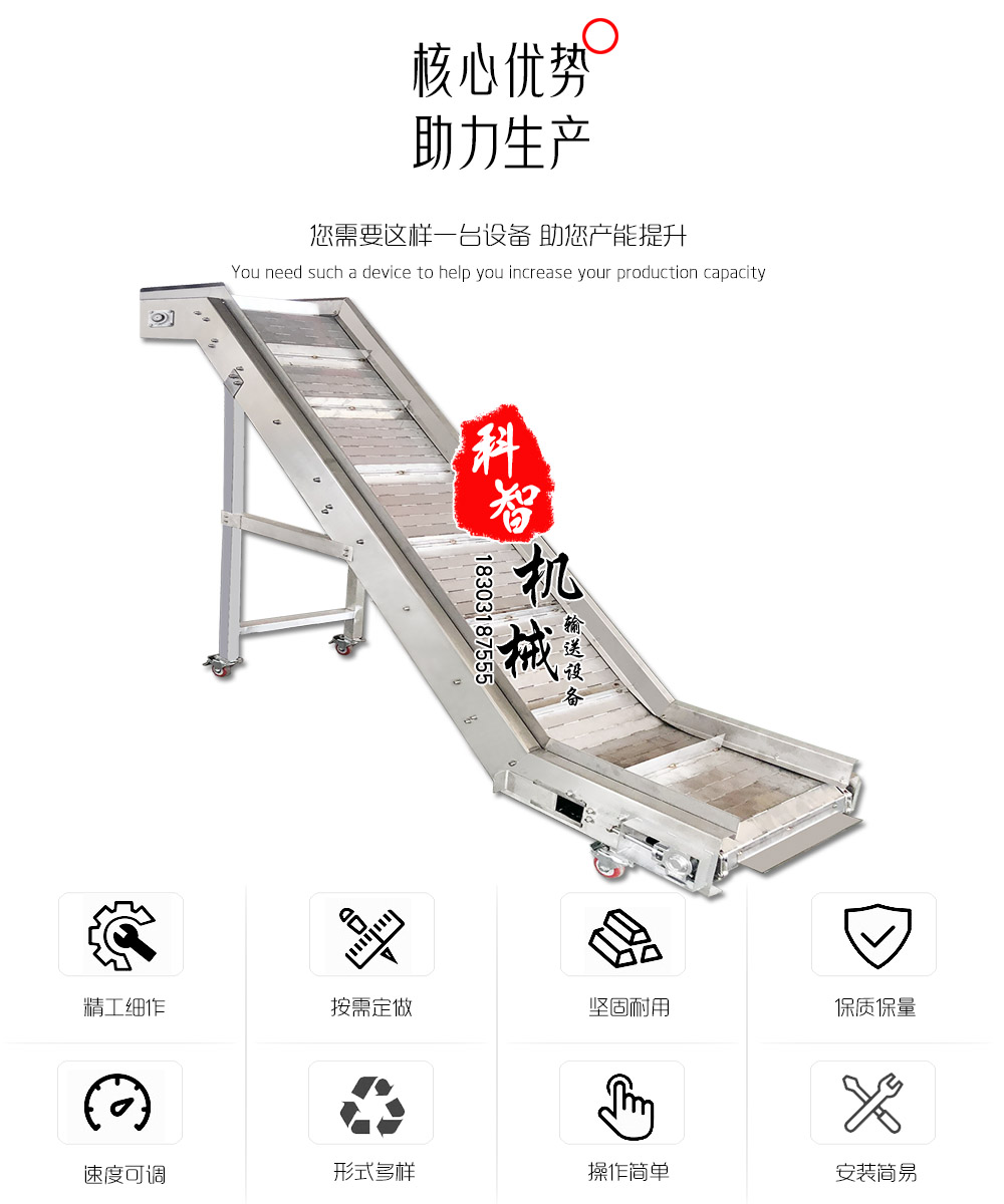 1)鏈板提升輸送機設備常用來有次序地運送零整貨物和各種包裝物品等.由于其結構堅固.可在重載的輸送工作中使用,適用于裝卸點有沖擊力的場合,如:螺絲螺母、擠壓鋁型材、機床鐵削。當提升坡度超過10度時需安裝擋板,這時輸送的斜度可達30-40度之間。